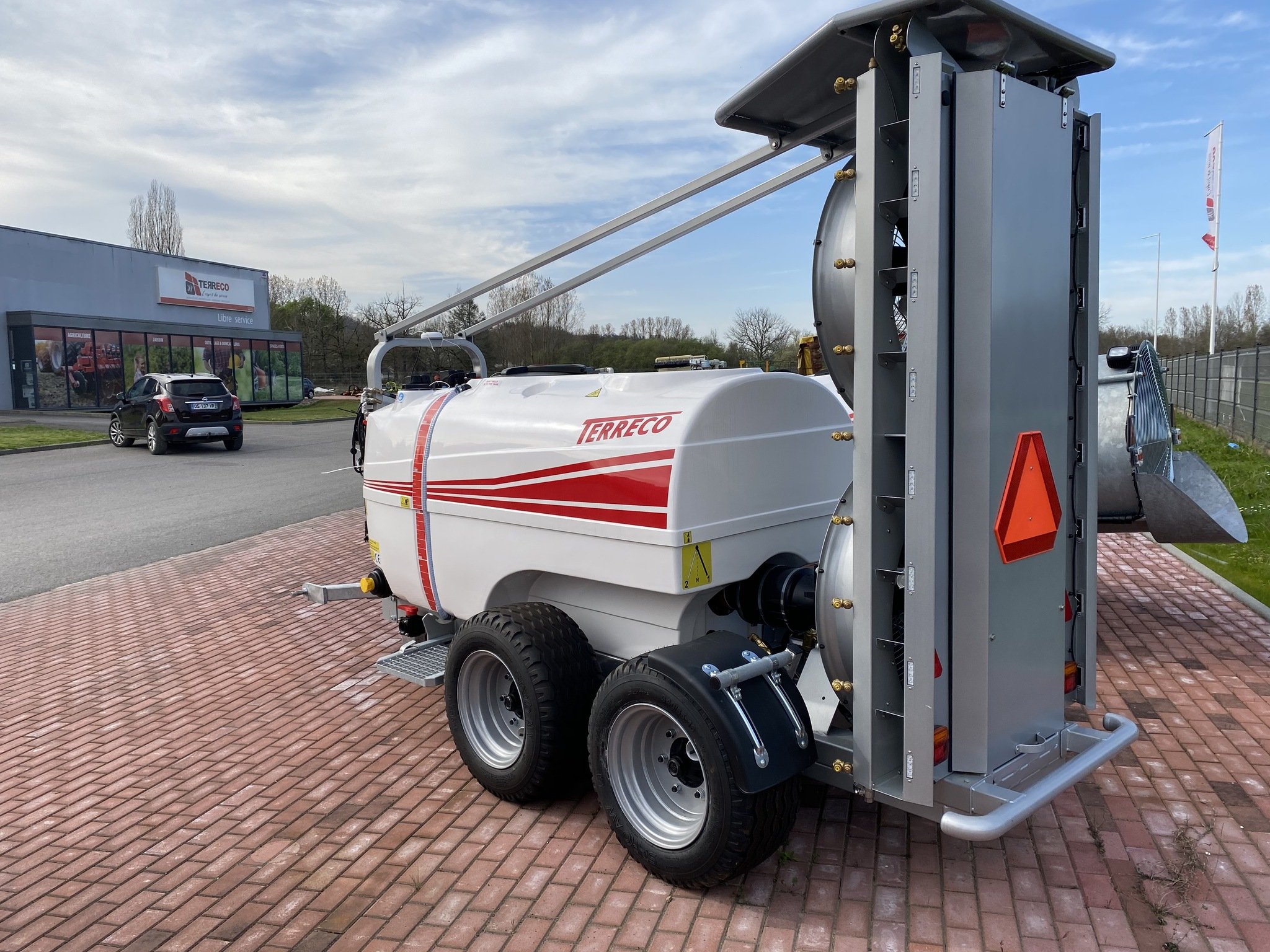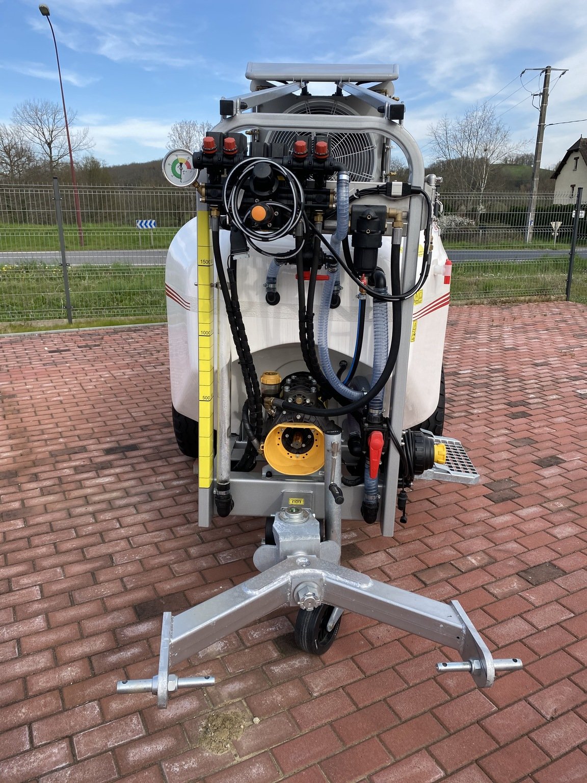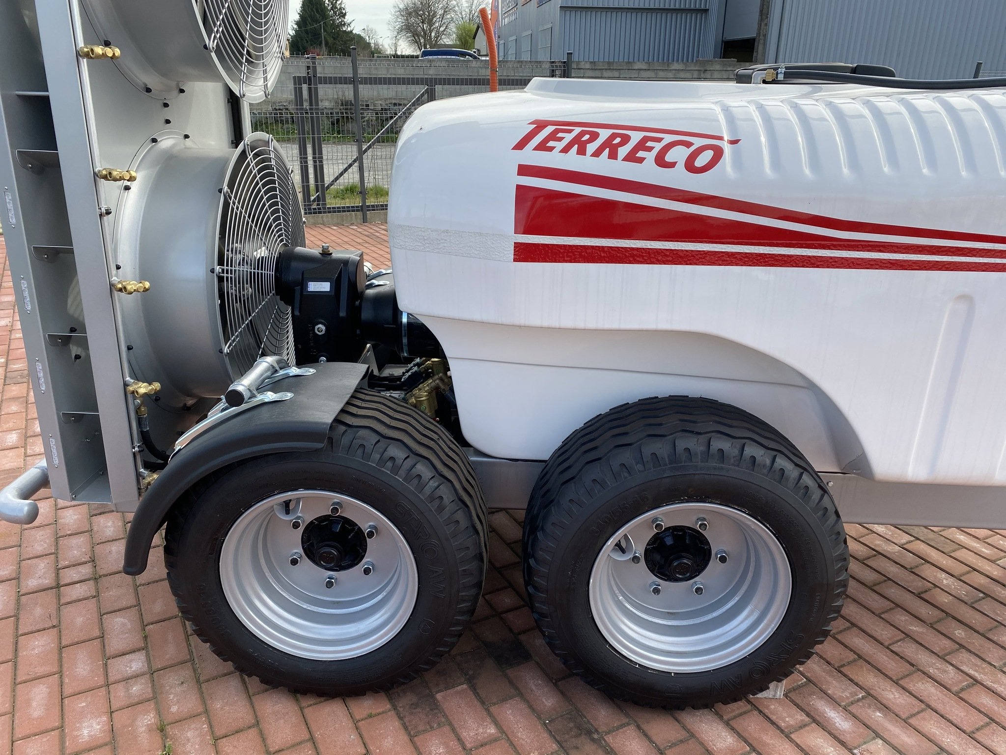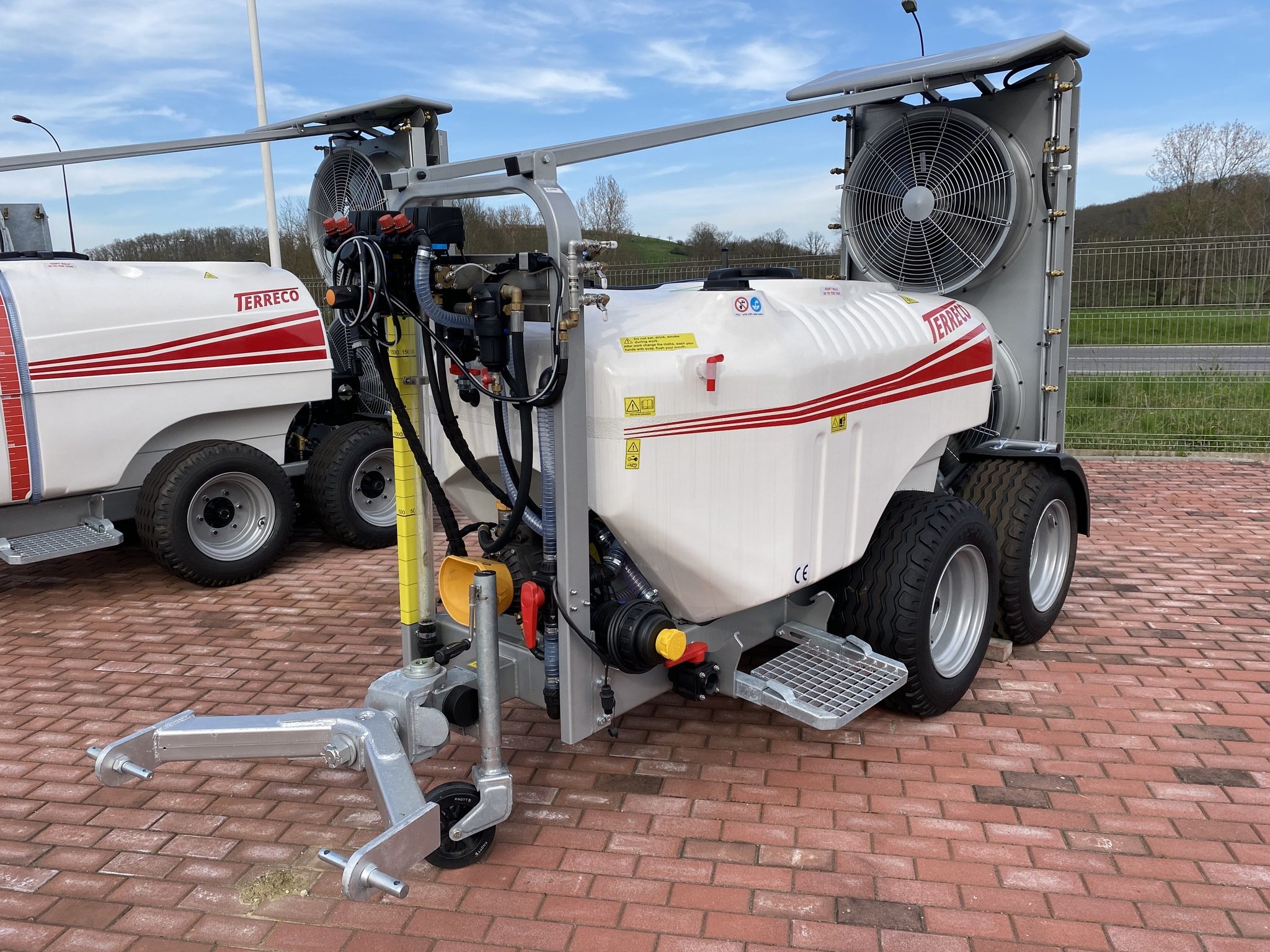 atomiseur 1500 L cuve fibre de verre , chassis galvanisé plus peinture bio , attelage tournant, cuve de rinçage , voute inox avec 2 hélices de 700 mm silencieuses , 2 essieux 4 roues , pompe à membranes 125 l , GPS , cardan grand angle , lave main, jauge à l'avant, préparateur de bouillie, éclairage led des jets,
